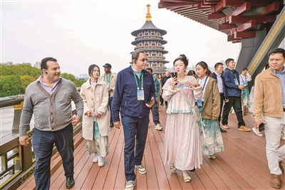 在应天门遗址博物馆,嘉宾们观看了《天门快闪》与鄂伦春族鼓舞等融合传统与现代的演出。节目主持人、网红史蒂文·维德斯赞叹:“表演极具中国特色,让我大开眼界。更让我震撼的是洛阳所展现的古今贯通——今天在应天门、龙门石窟会聚的八方宾朋,仿佛重现了丝路起点万商云集的盛景。”